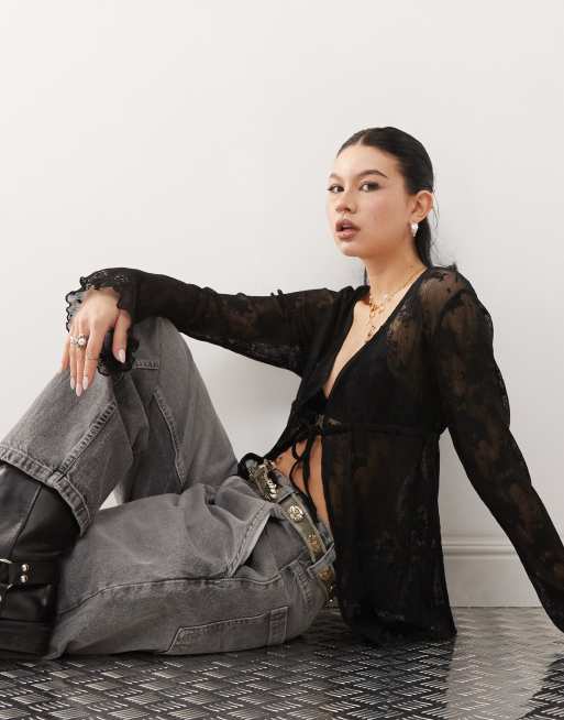 Collusion – Langärmliges Oberteil mit floralem Falten-Design und Bindedetail vorn