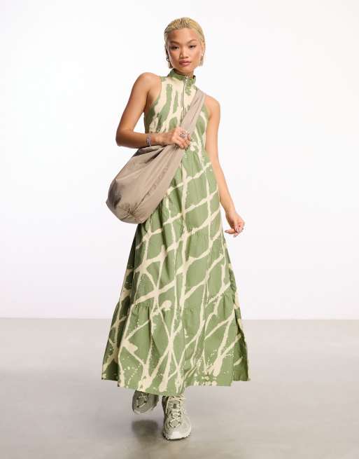 COLLUSION – Maxi-Hängerkleid aus Baumwolle in Grün mit abstrakter Waschung und Reißverschluss