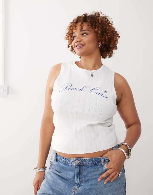COLLUSION Plus – Tanktop aus Pointelle in Weiß mit Print
