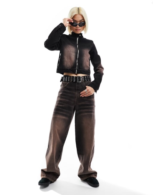 COLLUSION – Set aus Bikerjacke mit knappem Schnitt und Jeans in rosa 2000er-Waschung
