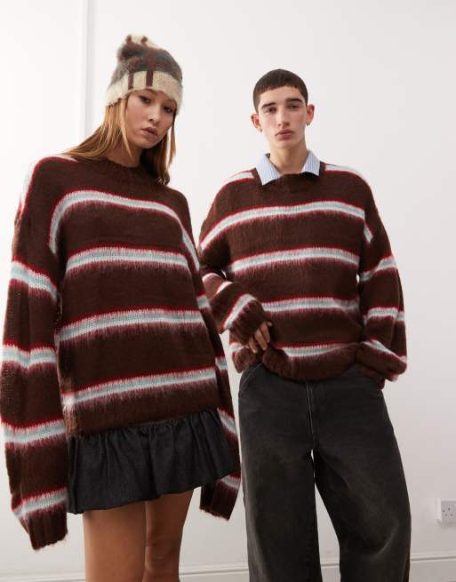COLLUSION Unisex – Angerauter Oversize-Pullover in Lila mit Rundhalsausschnitt und Streifen