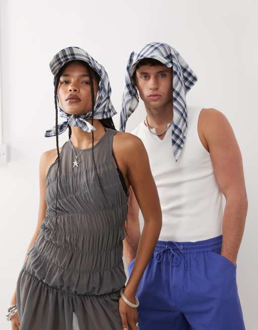 COLLUSION Unisex – Blau kariertes Kopftuch mit Schirmkappen-Detail