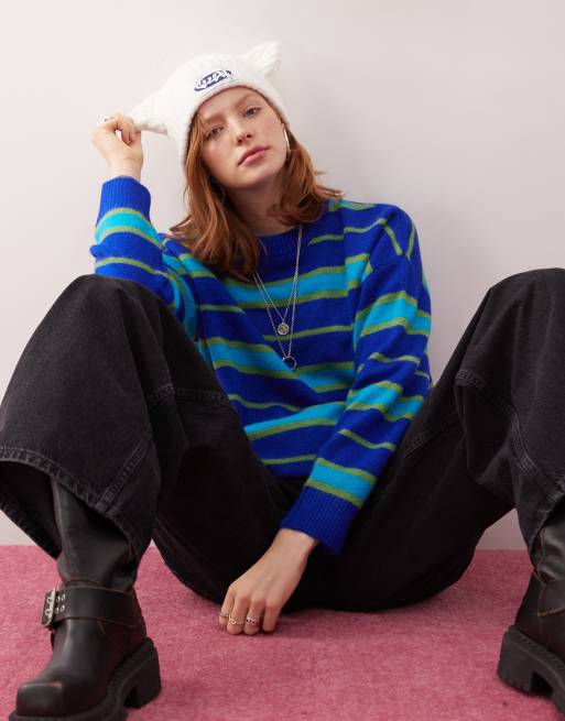 COLLUSION Unisex – Flauschiger Strickpullover in Blau gestreift