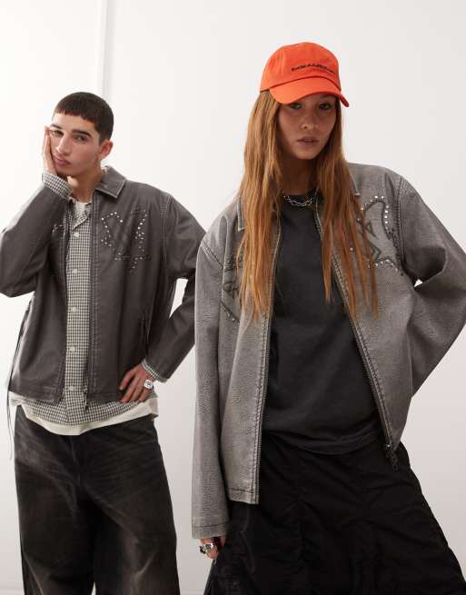 COLLUSION Unisex – Harrington-Jacke aus Kunstleder in Grau mit Markenlogo und Used-Details