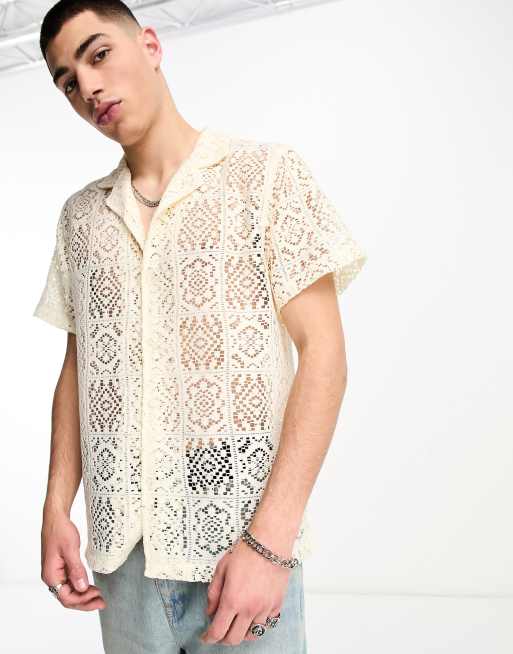 Coney Island Picnic – Kurzärmliges Hemd in weißer Häkeloptik mit Reverskragen