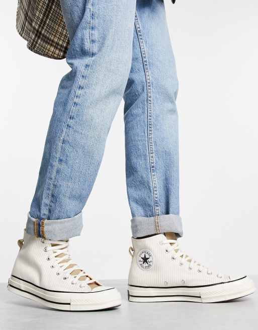 Converse – Chuck 70 Hi Craft – Knöchelhohe Leinen-Sneaker mit Hickory-Streifenmuster in Stein und Weiß