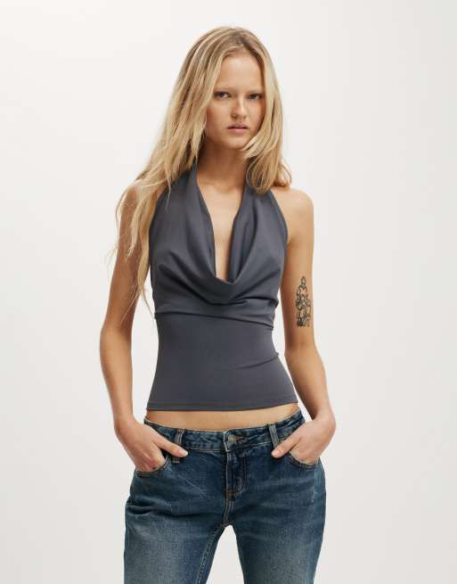 Cotton On – Georgie – Neckholder-Oberteil in Grau mit Wasserfallausschnitt