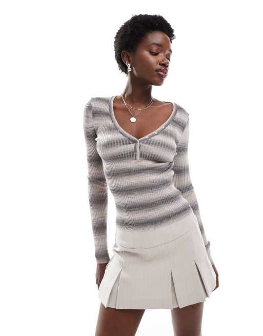 Cotton On – Langärmliges, geripptes Henley-Oberteil aus Strickstoff in Seemoos mit Spacedye-Optik