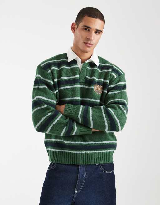 Cotton On – Langärmliges, kastiges Rugby-Polohemd in Club-Grün mit Streifen