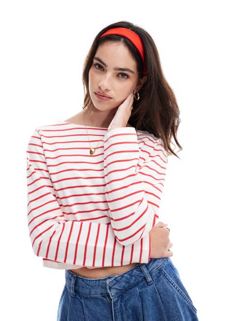 Cotton On – Langärmliges, kurzes Oberteil mit roten Streifen und U-Boot-Ausschnitt