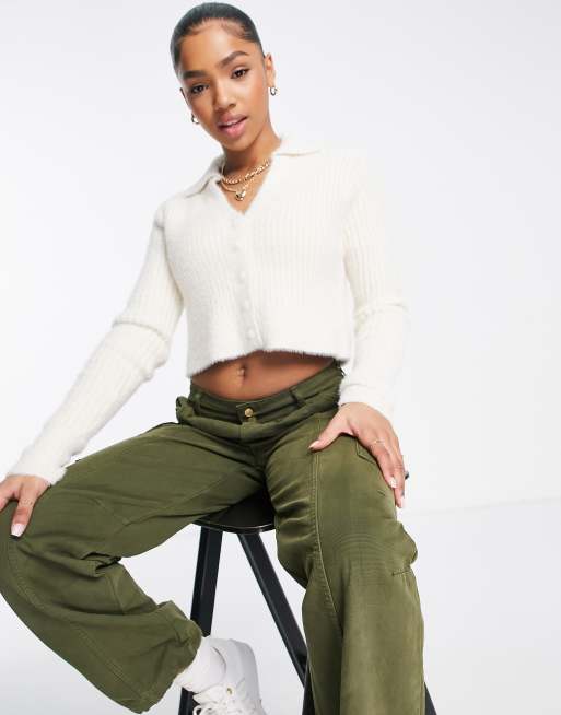 Cotton:On – Flauschige Strickjacke in Creme mit Kragen