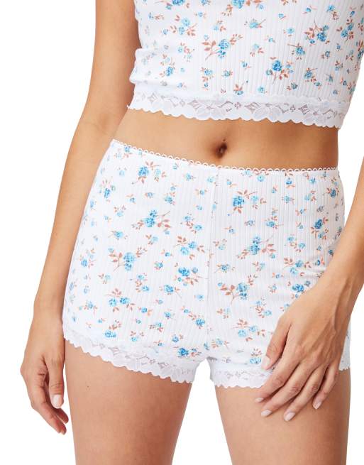 Cotton:On – Gerippte Pyjama-Shorts in Weiß geblümt mit Spitzensaum