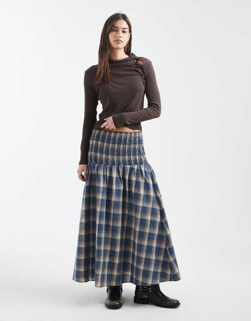 Daisy Street – Gestufter, karierter Maxirock in Blau mit tiefer, gesmokter Taille