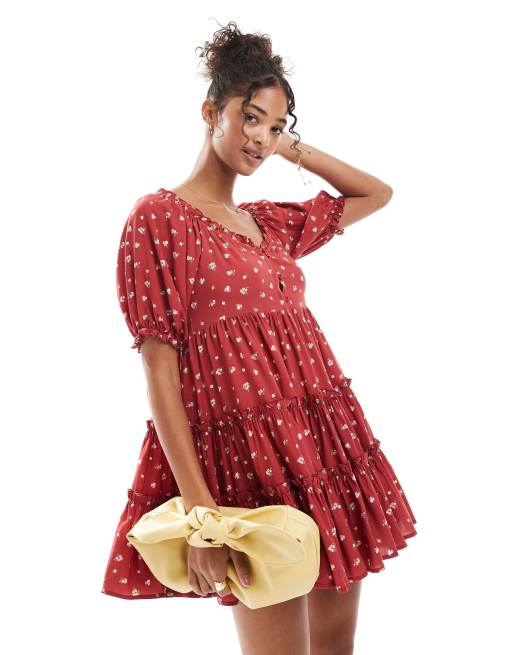 Daisy Street – Gestuftes Hänger-Minikleid in Rot mit Blümchenprint
