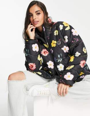 Daisy Street – Hochgeschlossene Steppjacke in Schwarz geblümt