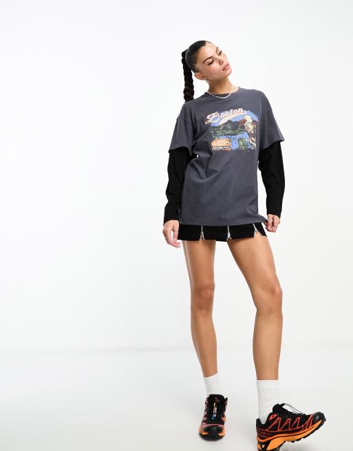 Daisy Street – Lässig geschnittenes, zweilagiges T-Shirt in Grau und Schwarz mit Boston-Grafik