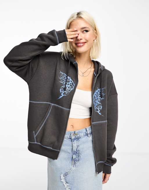 Daisy Street – Oversize-Kapuzenjacke in verwaschenem Grau mit Reißverschluss vorne und Schmetterlingsgrafik