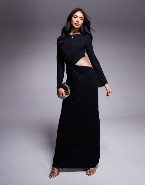 ASOS DESIGN – Leinenmix-Maxikleid in Schwarz mit tief angesetzter Taille und tiefem Rückenausschnitt