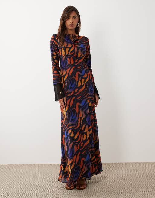 Daska – Chiffon-Maxikleid mit Bindedetail und abstraktem Animalprint in Orange und Blau