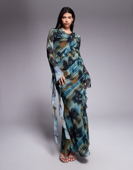 Daska – Chiffon-Maxikleid mit Schottenkaro und Rüschen