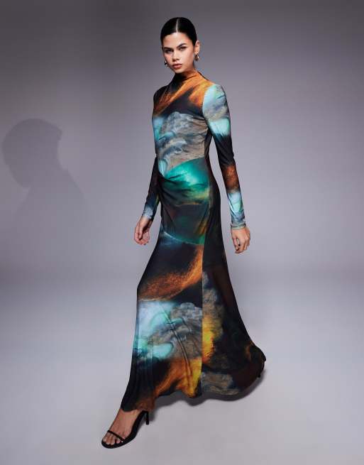Daska – Hochgeschlossenes Maxikleid mit abstraktem Muster und verdrehter Drapierung
