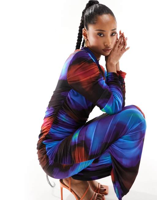 Daska – Langärmliges, gemustertes Midikleid in Marineblau mit Raffung