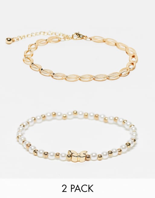 DesignB London – 2er-Pack Ketten- und Perlenarmbänder in Gold
