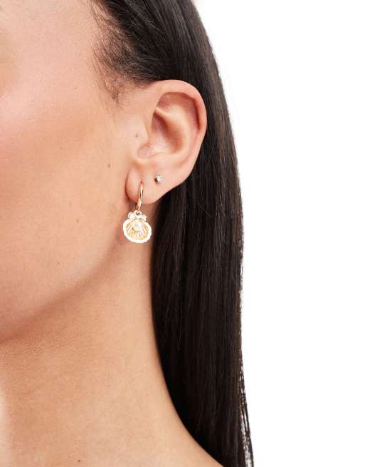 DesignB London – Kleine goldfarbene Creolen mit Muschel-Kunstperlen-Anhänger