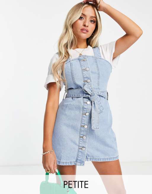 DTT Petite – Jeans-Latzkleid in Hellblau mit Bindegürtel in der Taille