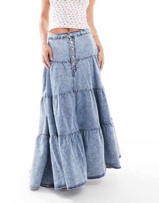 DTT Petite – Maxi-Jeansrock in blauer Acid-Waschung mit Rüschen