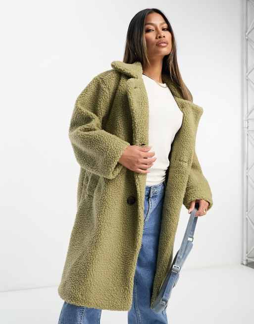 DTT – Zweireihige Longline-Jacke aus Teddyfell in Salbeigrün