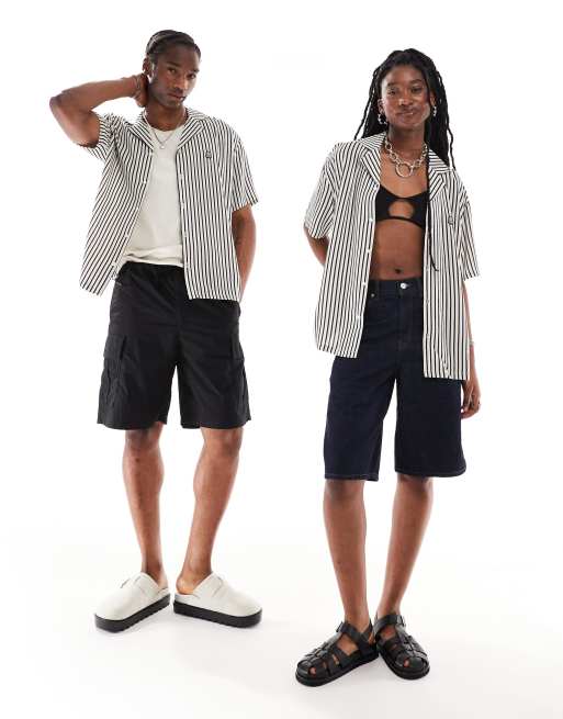 Dr. Denim – Madi – Locker geschnittenes Unisex-Kurzarmhemd mit kleinem bohnenförmigem Aufnäher und Streifen in Schwarz, Weiß und Grün