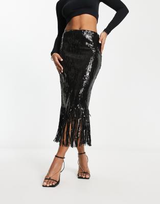 EDITED – Midi-Paillettenrock in Schwarz mit Fransensaum, Kombiteil