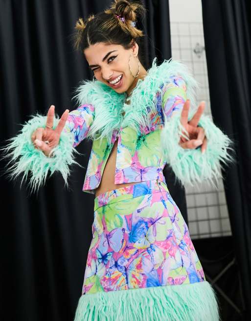 Elsie & Fred – Cropped-Cardigan aus Samt mit Retro-Schmetterlingsmuster und Kunstpelzbesatz, Kombiteil