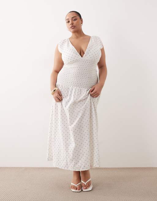 Esmée Curve – Gesmoktes Maxi-Strandkleid in Weiß mit schwarzen Punkten und mittelhoher Taille