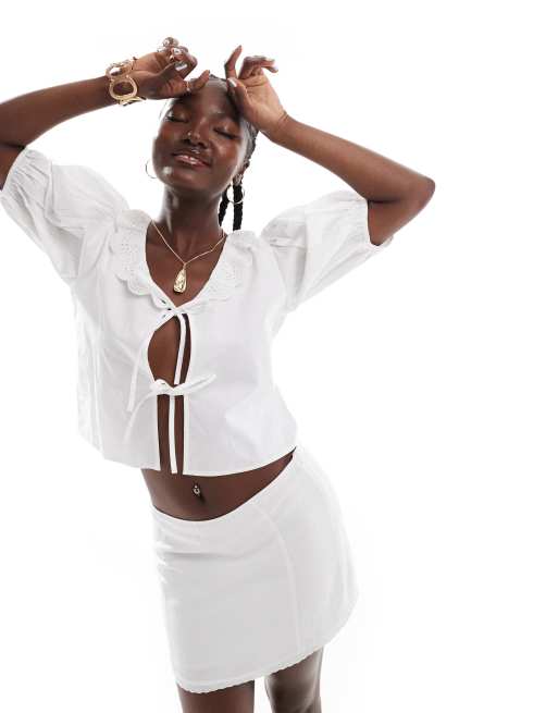 Esmée – Exclusive – Vorne gebundenes Oberteil aus Baumwoll-Popeline in Weiß mit Spitzenkragen