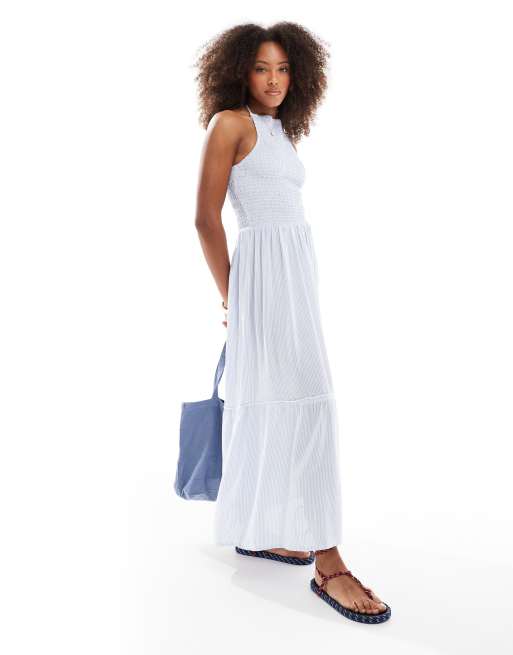 Esmée – Exklusiv – Gesmoktes Maxi-Strandkleid in Blau und Weiß gestreift mit Neckholder