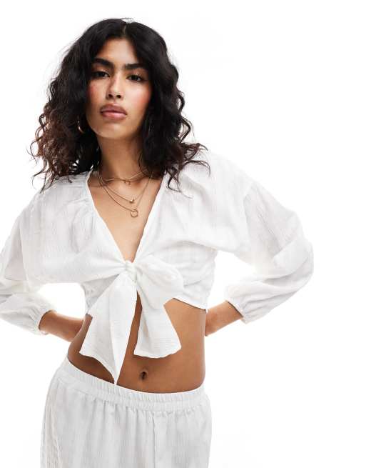 Esmée – Strandoberteil in gebrochenem Weiß mit Puffärmeln und gebundener Vorderseite, Kombiteil