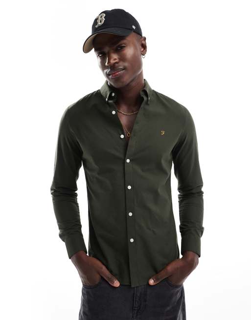 Farah – Brewer – Langärmliges Oxford-Hemd in Khaki mit schmalem Schnitt