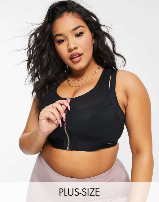 Figleaves Curve – Sport-BH mit Riemchendesign hinten und Reißverschluss vorne in Schwarz