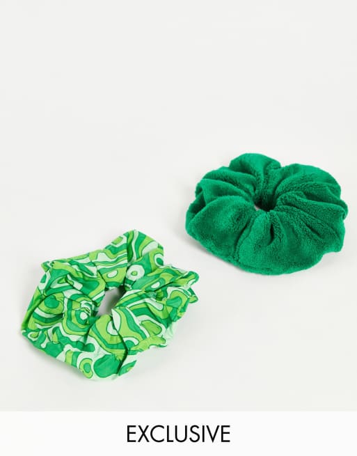 The Flat Lay Co. x ASOS – Exklusives Haargummi-Set – Lavalampen-Print in Grün und Frottee in Grün