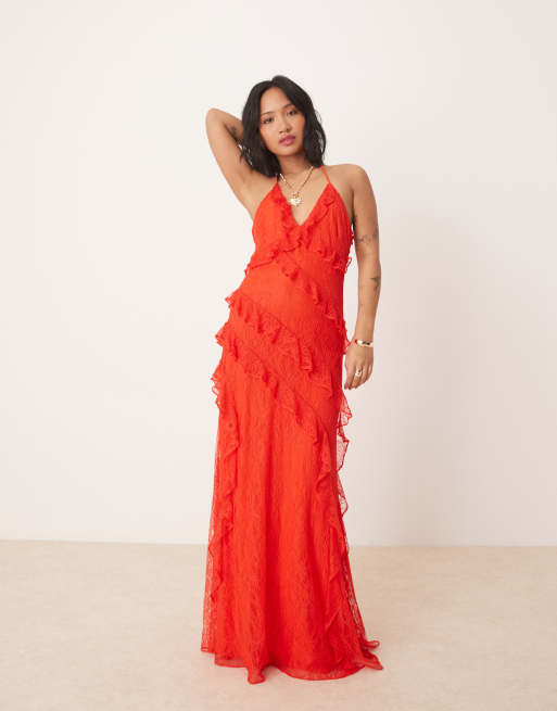 Forever New Petite – Maxikleid aus Spitze in Rot mit Rüschen