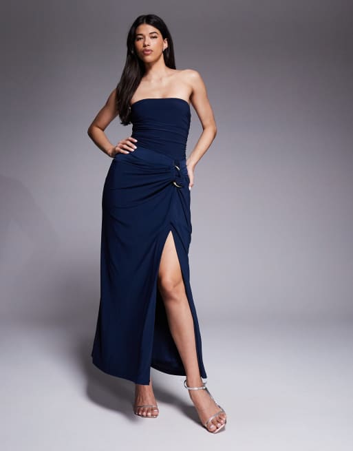 Forever New – Anschmiegsames, trägerloses, wadenlanges Kleid in kräftigem Marineblau mit Raffung, D-Ring und seitlichem Schlitz