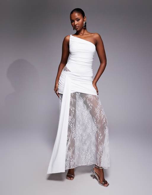 Forever New Bridal – Gerafftes Maxi-Brautkleid aus Spitzenmix in Weiß mit One-Shoulder-Träger und Zierausschnitt