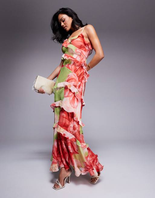 Forever New – Geblümtes Maxikleid in Rot und Limettengrün mit Rüschen