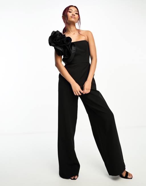 Forever New – Jumpsuit in Schwarz mit One-Shoulder-Träger und Ansteckblumen-Detail