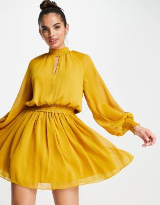 Forever New – Langärmliges Minikleid im 70er-Jahre-Stil mit Schlüsselloch-Design in Senfgelb