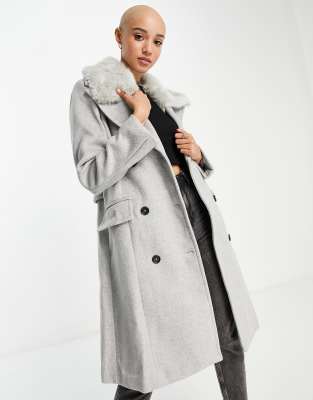 Forever New – Mantel in Grau mit Kunstpelzkragen