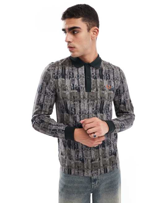 Fred Perry – Langärmliges Polohemd in Grün mit großflächigem Wald-Military-Muster