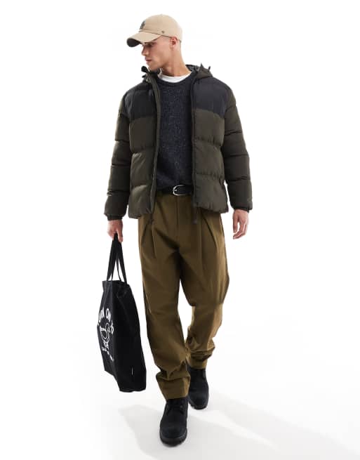 French Connection – Pufferjacke in Schwarz und Khaki mit Kapuze